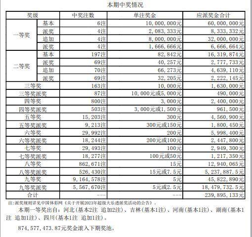 二等奖中出197注,单注奖金8.2万元,其中70注选择追加投注,每注奖金14.8(含基本8.2万+追加6.6万),69注符合本次派奖的派奖条件,每注奖金22万元(基本8.2万+追加6.6万+派奖7.2万)。