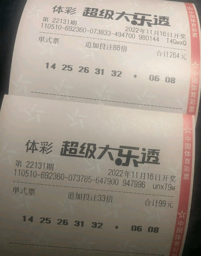还有一张晒票图中,有两张合计高达121倍的单式倍投票,当中仅仅只有一注相同号码,彩友的野心也不小,原本打算挑战清空奖池,但是最后却失望而归,变得一文不值。