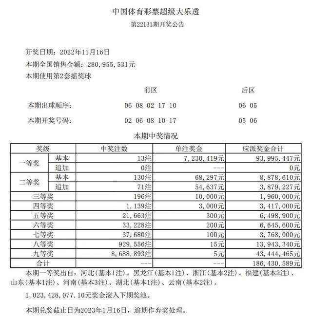 第22131期大乐透开奖号码为:02 06 08 10 17+05 06,整体上十分有趣,前区号码开出全小号组合,大号全部落空,而且出现了断大区的现象;不仅如此,蓝区同样是全小号组合,而且是连号形态。