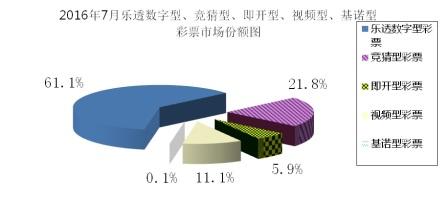 7月份,乐透数字型彩票销售198.21亿元,同比增加17.00亿元,增长9.4%;竞猜型彩票销售70.78亿元,同比增加39.28亿元,增长124.7%;即开型彩票销售18.97亿元,同比减少3.60亿元,下降15.9%;视频型彩票销售35.88亿元,同比增加0.96亿元,增长2.8%;基诺型彩票[1]销售0.18亿元,同比减少0.08亿元,下降32.0%。7月份,乐透数字型、竞猜型、即开型、视频型、基诺型彩票销售量分别占彩票销售总量的61.1%、21.8%、5.9%、11.1%和0.1%。