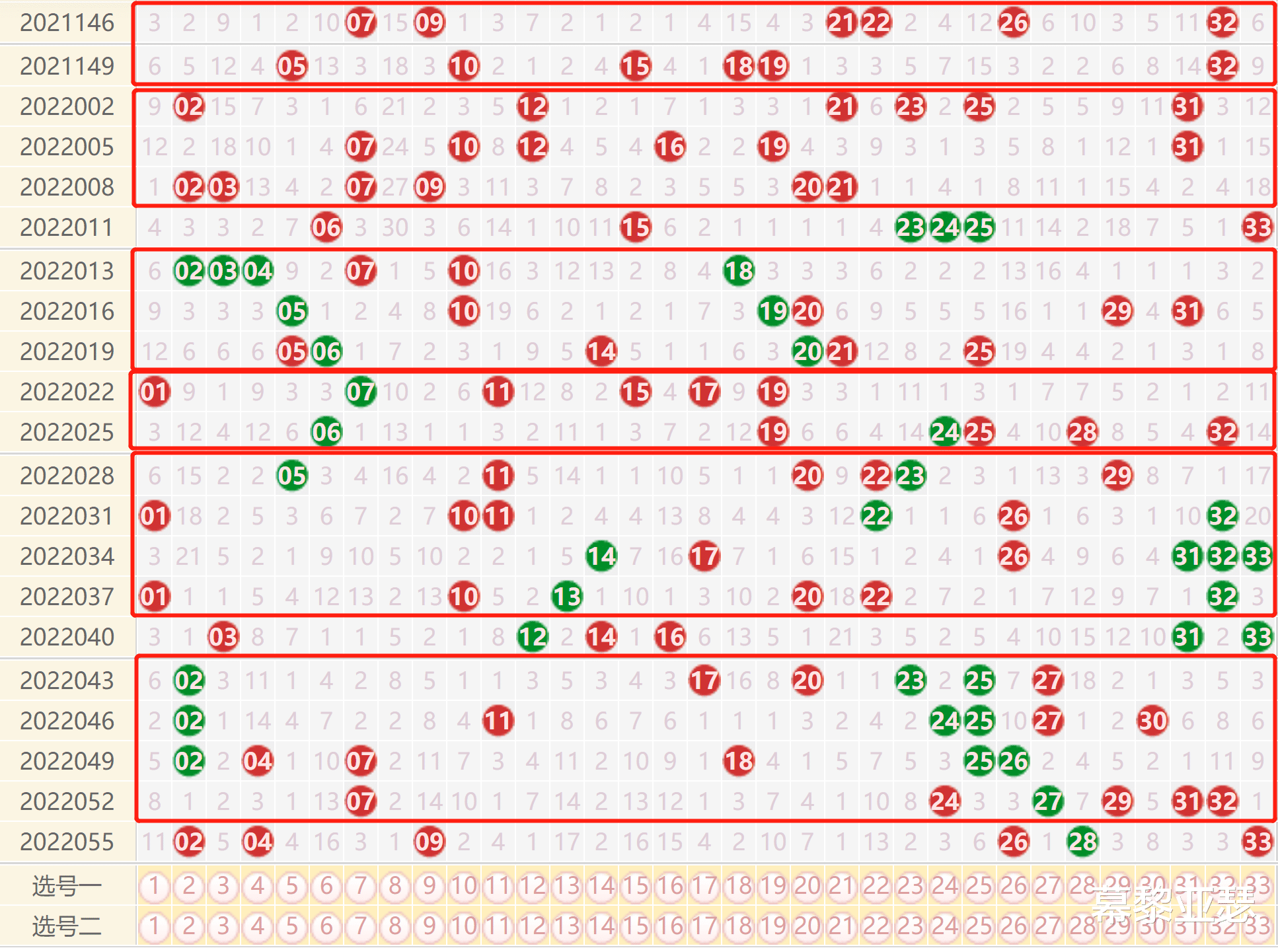 红球02:基本走势图,本期同红球08、14形成间隔三期斜三连,周二走势图,本期同红球07、12形成间隔两期斜三连,历史走势图,本期同红球07、12、17、22形成的间隔三期斜五连不太符合红球02出号,因此本期不看好红球02出号。