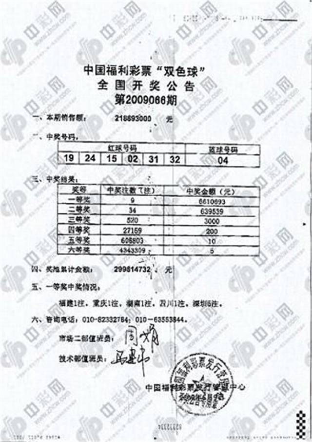 2009年6月9日晚上,正值当年双色球第66期开奖的关键时刻,当晚公布的中奖号码分别是红球02、15、19、24、31和32,蓝球号码为04。全国范围内共计有9注幸运儿同时中得头奖,其中有5注大奖被广东深圳的彩民揽入囊中。根据了解,中奖的彩票是一张机选的5倍投注单,投注金额为10元,该票由福田区益田路某彩票站售出,而这5注一等奖奖金则被一位彩民独自夺得,总金额高达3305万元。当地《羊城晚报》当时大胆预测,这位幸运儿极有可能在2009年双色球富豪榜中排名第四。
