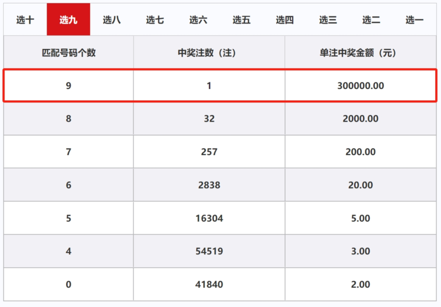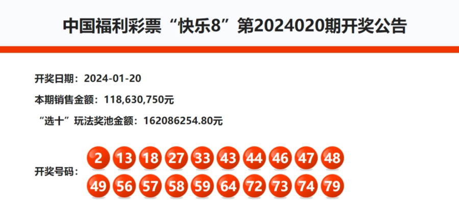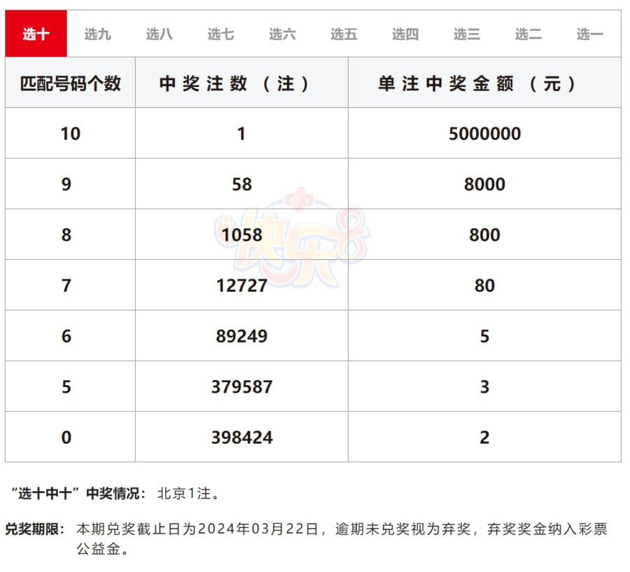 快乐8第2024020期,全国中出1注选十中十大奖,单注奖金500万元,大奖出自北京。